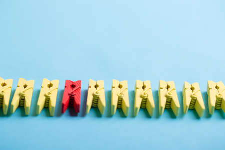 Stand out from the crowd and different concept. Leadership and other similar concepts. One red clothespin stands out from other yellow clothespins on blue background.
