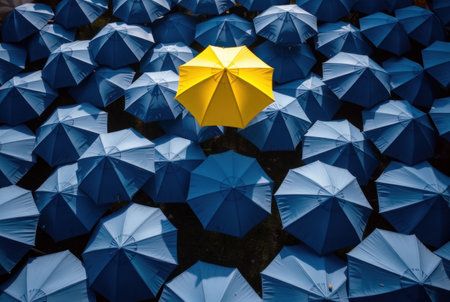 Top-down view of a yellow umbrella among a crowd of black umbrellas, symbolizing individuality and boldness
