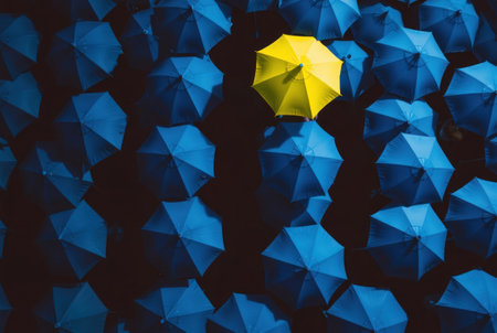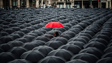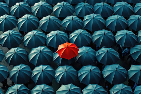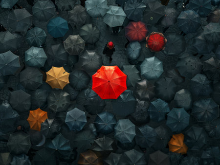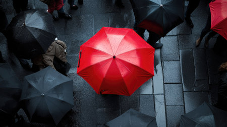 Red umbrella among black umbrellas: embrace uniqueness, stand out, and dare to be different.