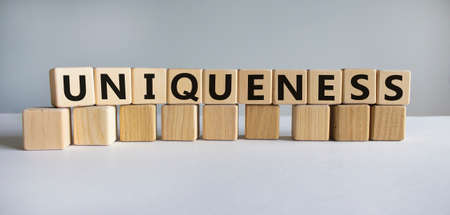Inclusiveness and uniqueness symbol. Wooden cubes with the word 'uniqueness'. Beautiful white background. Business, inclusiveness and uniqueness concept. Copy space.