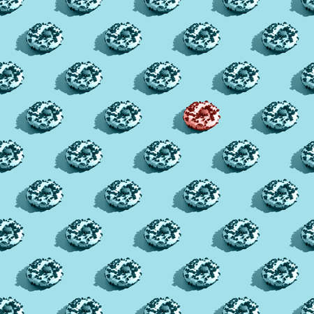 Doughnut pattern. Pink color. Tasty unhealthy round food. Blue background. Many donuts with shadow. Berry bake snack. One size. Breasfast with coffee and snack. Lots dessert