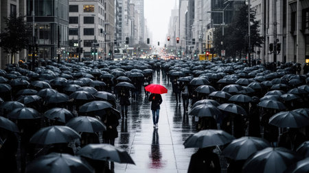 A single individual with a red umbrella stands out in a crowd of people holding black umbrellas in a rainy urban environment. The image features a contrasting color scheme with a focus on symmetry and perspective. The scene, potentially captured during the day, may be suitable for editorial or commercial content.