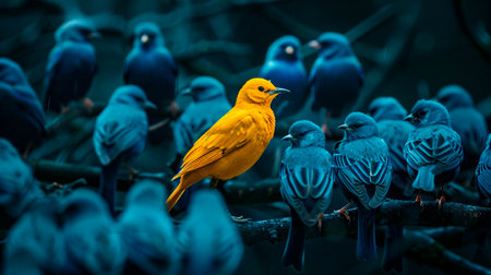 Standing Out: The Yellow Bird Amongst Blue Birds Representing Individuality and Courage. Concept Individuality, Courage, Standing Out, Yellow Bird, Blue Birds