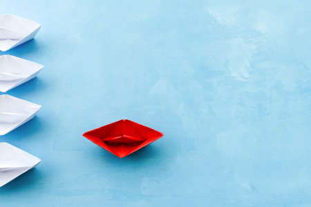 The concept of leadership. The red flagship paper ship leads the others ahead on a blue background.