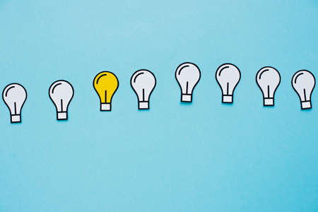 Outstanding glowing yellow light bulb among blue light bulbs 3D illustration with clipping path. 3D rendering