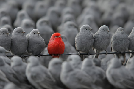 A compelling portrayal of individuality, this features a vibrant red bird in stark contrast to the muted gray birds, highlighting differences and uniqueness.