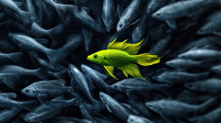 A neon green fish swimming against the current in a sea of grey fish, symbolizing unique perspective