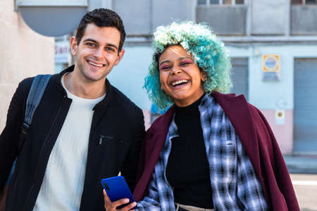 happy multiethnic couple on the street with mobile phone