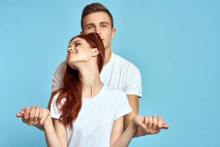 Cheerful man and woman in white t-shirts embrace friendship together