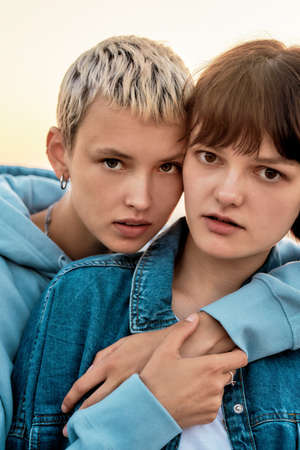 Portrait of two attractive young women with short hair looking at camera, Young lesbian couple spending time together