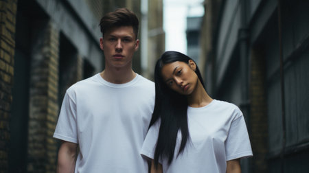 Young man and woman in white t-shirts standing in the city.