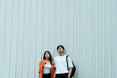 Teenage couple standing at the white wall as a fashion model.
