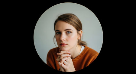 A young woman with light brown hair, wearing an orange sweater, has her hands clasped together in a praying position. The image is framed in a circular format with a dark background.