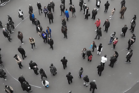 Aerial view of a group of people standing in a circle on the background of the earth