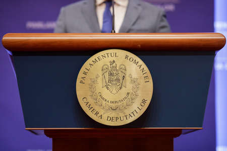 Bucharest, Romania - October 23, 2020: Romanian Chamber of Deputies (the lower house of the Romanian Parliament) logo on a desk while an MP is holding a press conference.