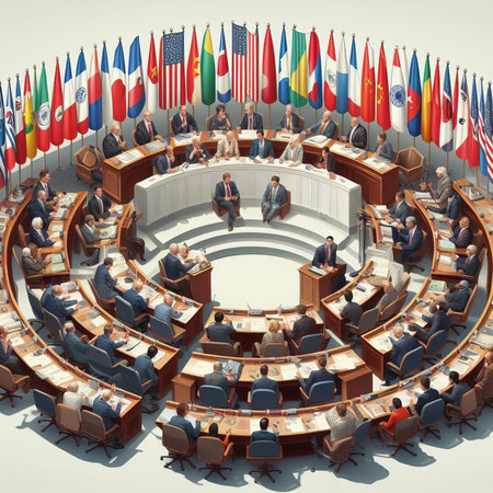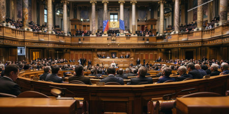 Top-down view highlights the organized layout of parliamentary seating with microphones, reflecting an institutional atmosphere conducive to discussions.