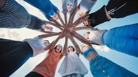Students coming together in a circle, representing unity, teamwork, and the power of friendship
