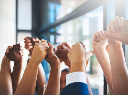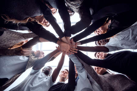 Theyre ready to go. Low angle shot of a group of unrecognizable businesspeople joining their hands together in unity.