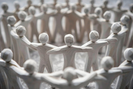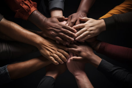 A team of people standing in a circle, holding hands to symbolize unity and harmony, Harmony and unity among a team of people