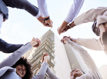 We did it. Low angle show of a diverse group of businesspeople huddled outside together and holding hands.