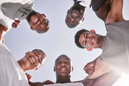 Portrait of sporty men from below joining in huddle for support and unity. Group of cheerful friends and motivated athletes collaborating together in solidarity as a happy team and diverse community