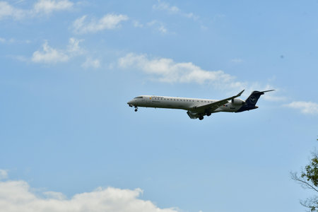 Victoria, Vancouver Island, British Columbia, Canada - August 25, 2021: Commercial Airliner airplane landing at the Airport during a sunny summer day.