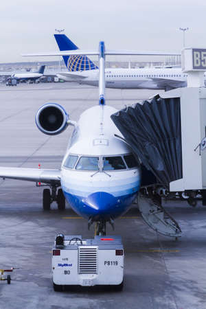 Denver, Colorado - 23 December, 2007: United Express CRJ-700 planes at gates at Denver International Airport.