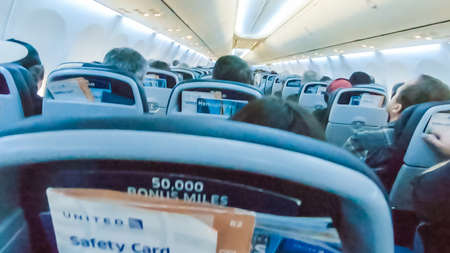 Economy class seats in mid size passenger airplane.