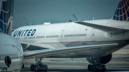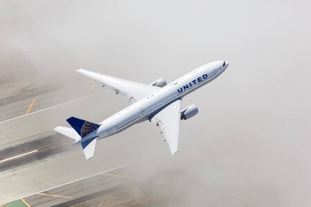Los Angeles, California – April 14, 2019: Aerial view of United Airlines Boeing 777-200 airplane at Los Angeles airport (LAX) in the United States.
