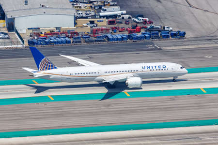 Los Angeles, California - April 14, 2019: Aerial view of a United Airlines Boeing 787-9 Dreamliner airplane at Los Angeles Airport (LAX) in the United States.