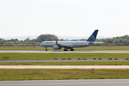 United Airlines Boeing 757 narrow-body passenger plane (N29129) departing from Manchester International Airport runway.