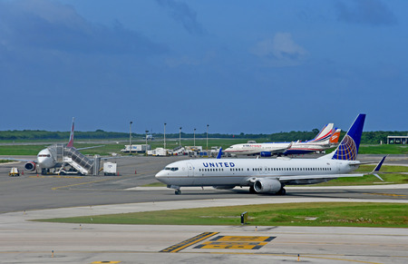 CANCUN, MEXICO - NOVEMBER 12, 2017: Airplanes on the runway of Cancun International Airport in Mexico. Airport is located on the Caribbean coast of Yucatan Peninsula, its second busiest airport in Mexico