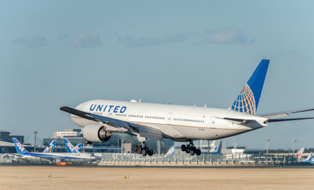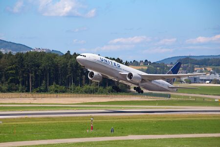 ZURICH - July 30: United Airlines taking off at Terminal A of Zurich Airport on July 30, 2016 in Zurich, Switzerland. Zurich airport is home port for Swiss Air and one of the european hubs.