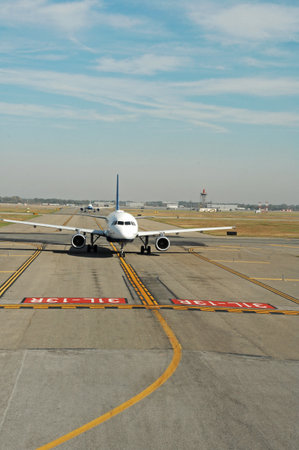 Airplane on the runway in the airport, closeup of photo
