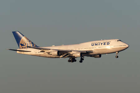FRANKFURT, GERMANY - JULY 21: United Airlines Boeing 747 landing at the Frankfurt International Airport (FRA). July 21, 2015 in Frankfurt Main, Germany