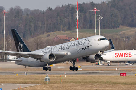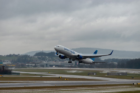 Zurich, Switzerland, February 10, 2022 United Airlines Boeing 767-322ER aircraft is taking off from runway 16 at the international airport