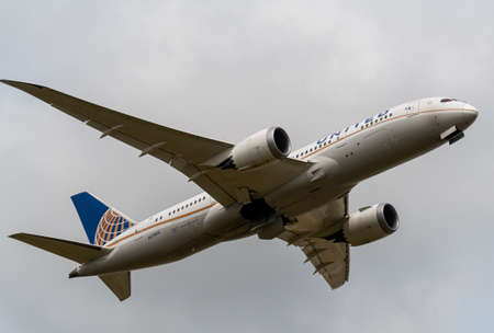 Heathrow, United Kingdom - August 03 2019: United Boeing 787-8 Dreamliner registration N27903, flight number UA26 departs Heathrow airport en route to Denver seen from Myrtle Avenue