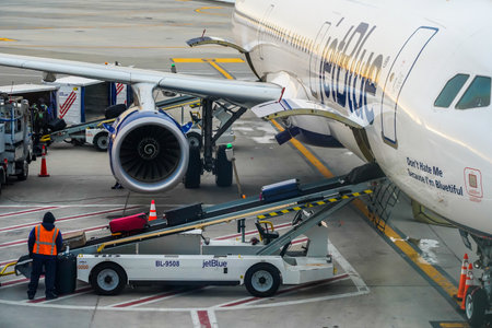 NEW YORK- DECEMBER 30, 2020: JetBlue baggage handler uploading luggage on tarmac at John F Kennedy International Airport in New York