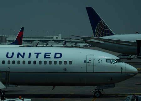 CHICAGO, ILLINOIS - OCTOBER 25, 2015: United Airlines planes at the gate at O Hare International Airport in Chicago