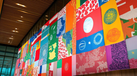 A detailed shot of a decorative banner at the entrance of the conference featuring a collage of international flags. Bright colors and intricate designs are visible as attendees ente