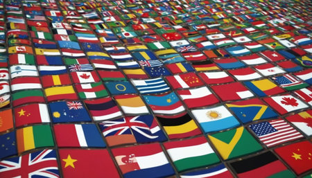A colorful arrangement of national flags forms a mosaic, with intricate lines connecting them, symbolizing unity among countries in a global context. The artwork captures the essence of diversity.