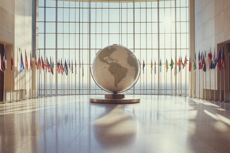 Elegant ballroom featuring a central globe surrounded by international flags and stunning views