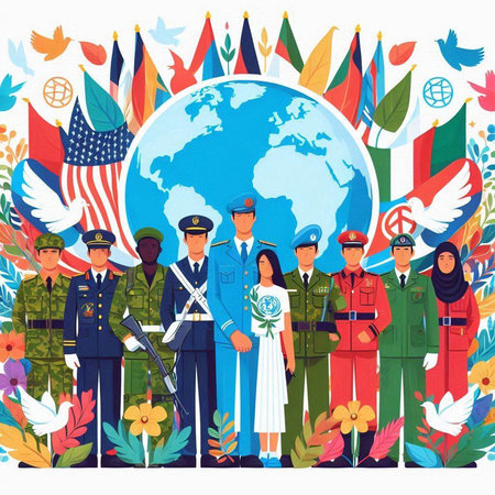 Selected national emblems and flags are arranged in a circular layout, symbolizing unity and diplomacy among countries with vibrant colors and designs.