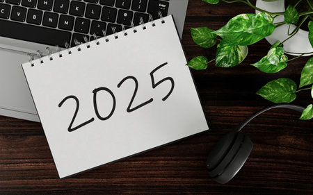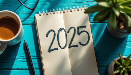 Planning for the future a notepad with 2025 written on it, surrounded by a coffee cup and potted plants. This vibrant scene captures the essence of goal-setting and fresh beginnings, inviting viewers to envision their aspirations for the upcoming year