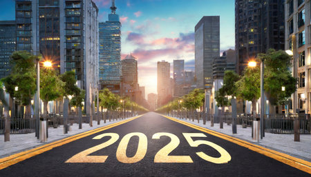 Banner. 2025 goal plan to success, Business target, growth strategy. New year resolution and challenge. 2025 on the road in the middle of asphalt road with at sunset forward and planning to the goal.