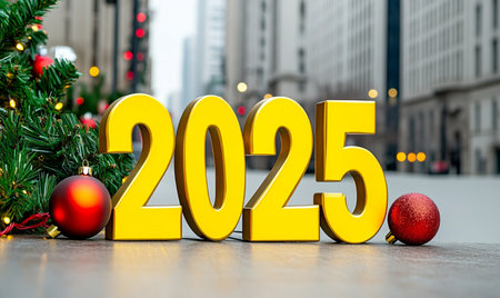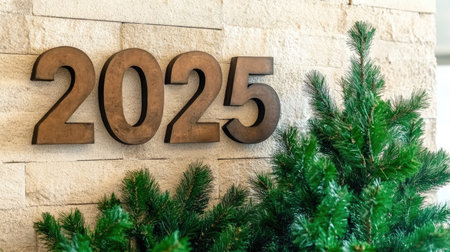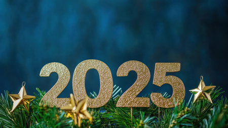 Golden numbers 2025 are adorned with holiday stars and surrounded by evergreen branches signifying the joy of new beginnings in winter.