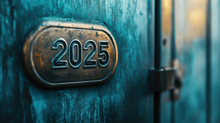 The image features the bold, rusted numbers 2025 prominently displayed against a striking turquoise backdrop. The weathered texture and patina of the numbers evoke a sense of nostalgia and anticipation for the new year, inviting viewers to reflect on the passage of time.