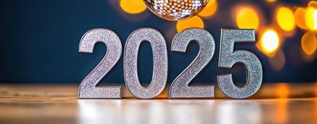 sparkling 2025 with disco ball above, perfect for celebrations.
