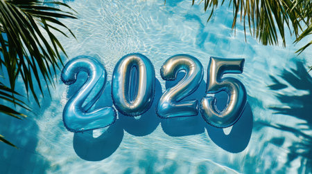 Bright inflatable numbers 2025 floating in a clear blue pool, reflecting sunlight, with tropical leaves casting shadows.