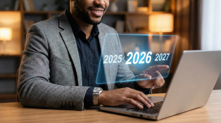 Smiling entrepreneur in a suit analyzes future business projections for 2026 on a futuristic holographic interface while working on a laptop in a modern office.